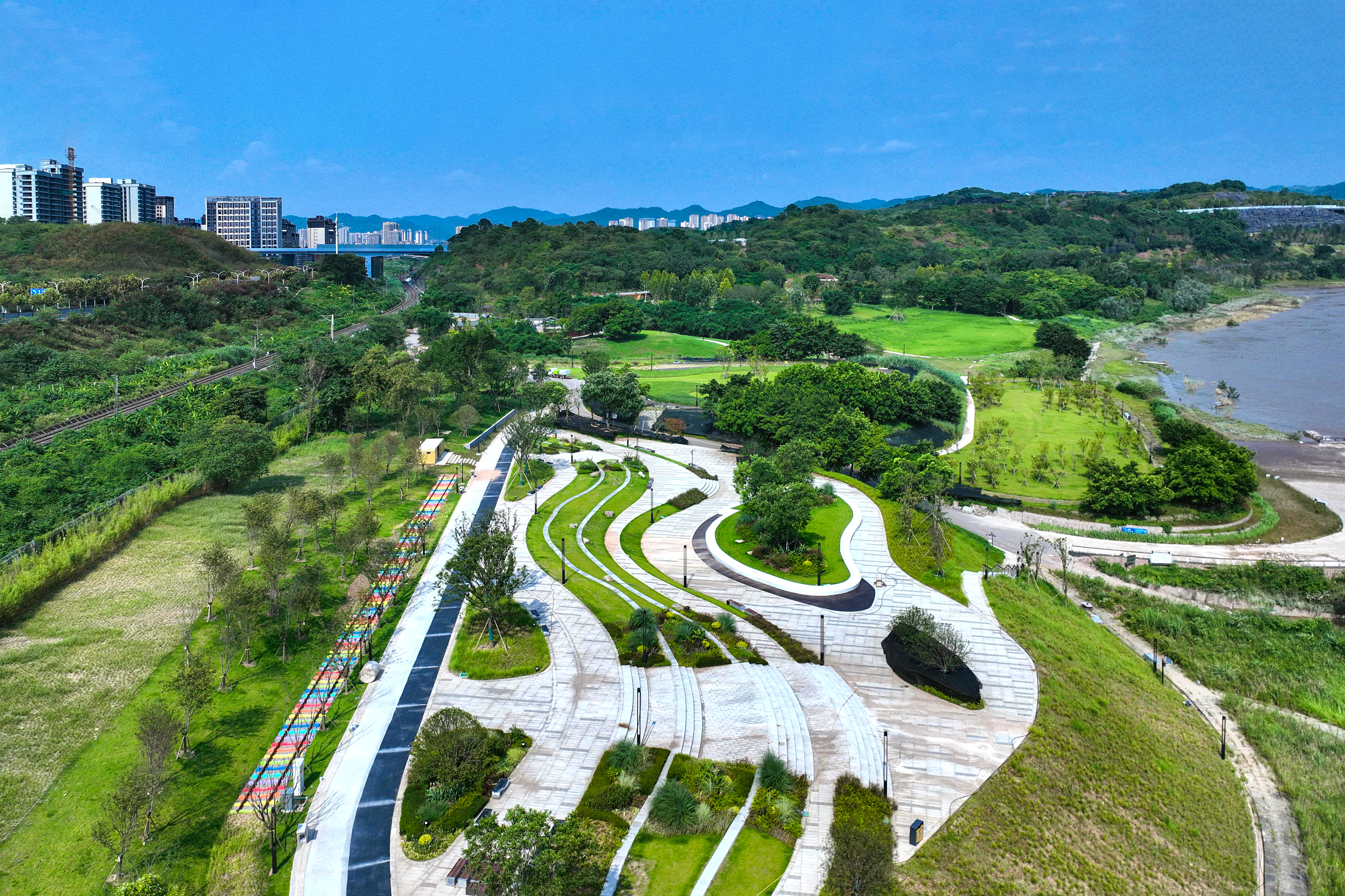 中冶建工承建的重慶“兩江四岸”治理提升長江北岸線延伸工程釣魚嘴濱江段項目,是重慶市重點工程,也是“兩江四岸”治理提升重點項目,全長約4.2公里,通過微改造,巧妙利用現有草海、森林、江灘等資源,彰顯原生態(tài)自然景觀,使生態(tài)美景連點成線,讓群眾享受更多開窗見景、推門見綠的城市空間,成為全國各地增植補綠、打造生態(tài)宜居城市的典范。